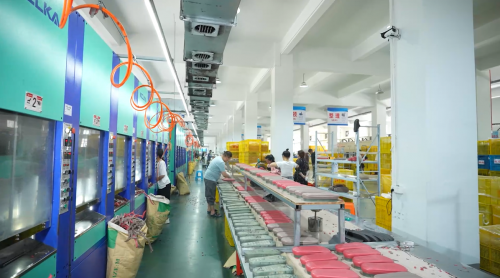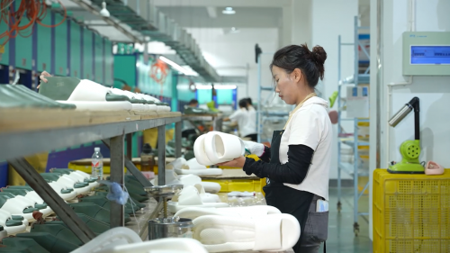十余年间,生产基地从最初的小车间扩展至占地约35亩的现代化园区,其中标准化厂房达7万平方米。走进厂区,可见20多台EVA专业成型机高速运转,200多台专业化缝纫机有序排列——这一体量稳居国内鞋类制造前列梯队。生产硬实力不止于“大”:车间内每一道工序均执行严格品控,从原料投料到成品出库,经过外观、硬度、回弹等多道质检关卡,确保内销与出口品质同标同线。